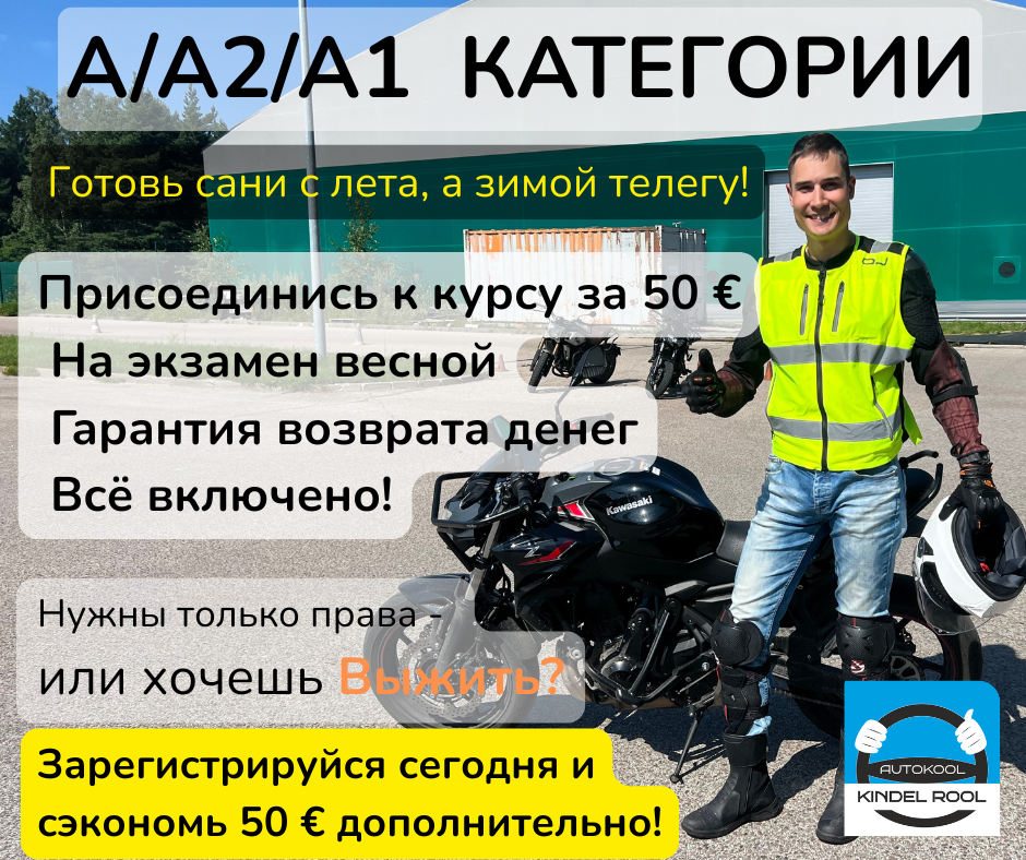 А, А2 категория полный пакет (при наличии B категории) — присоединись к курсу за 50 € и получи дополнительную скидку 50 €